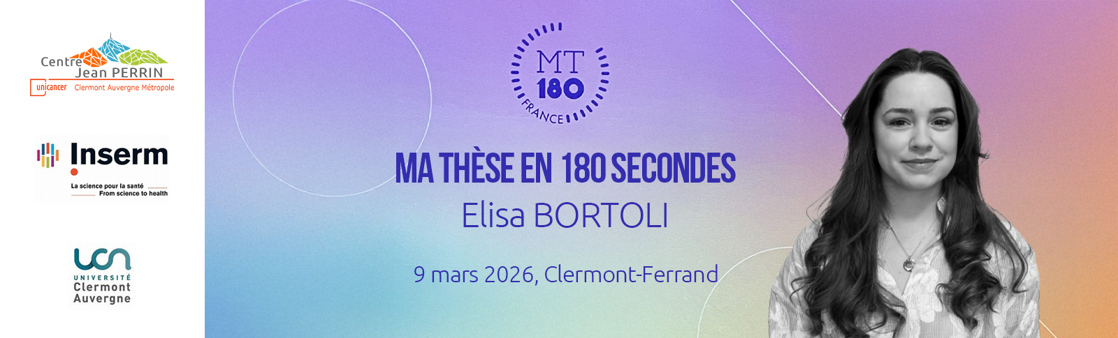 Lundi 9 mars 2026, à la Maison de la Culture de Clermont-Ferrand, Elisa BORTOLI a brillamment représenté l’unité UMR 1240 Inserm/UCA Imost lors du concours « Ma thèse en 180 secondes » (MT180). Ce concours met au défi les doctorants de vulgariser leur thèse en seulement 3 minutes, pour la rendre accessible et compréhensible au grand public.