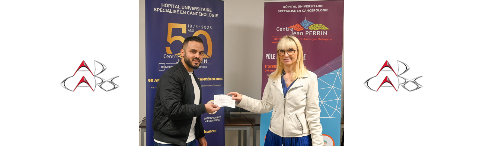 Marc DE CASTRO, Conseiller Commercial, est venu remettre à Sandrine ALBARET, Directrice Communication et Mécénat du Centre Jean PERRIN un chèque correspondant aux bénéfices récoltés lors de la collecte de dons organisée à l’occasion d’Octobre Rose.