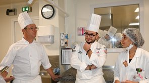 Jeudi 12 octobre 2023, le chef étoilé Adrien DESCOULS, du restaurant Origines au Broc, et une partie de son équipe sont venus renforcer le service restauration du Centre Jean PERRIN afin de proposer aux patients un menu gastronomique.