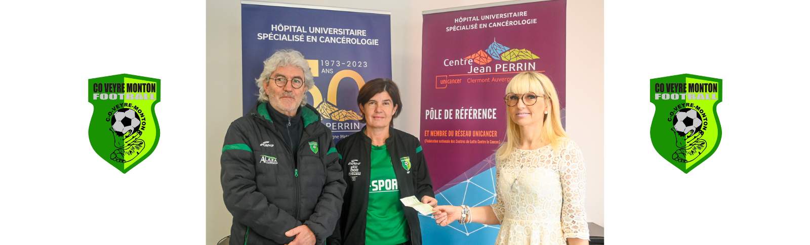 Thierry BAPT, Vice-Président du Club de Foot de Veyre-Monton, et Nathalie POUMEYROL, Coach des U13, sont venus remettre à Sandrine ALBARET, Directrice Communication et Mécénat du Centre Jean PERRIN un chèque correspondant à une partie des bénéfices de la buvette du mois d’octobre.
